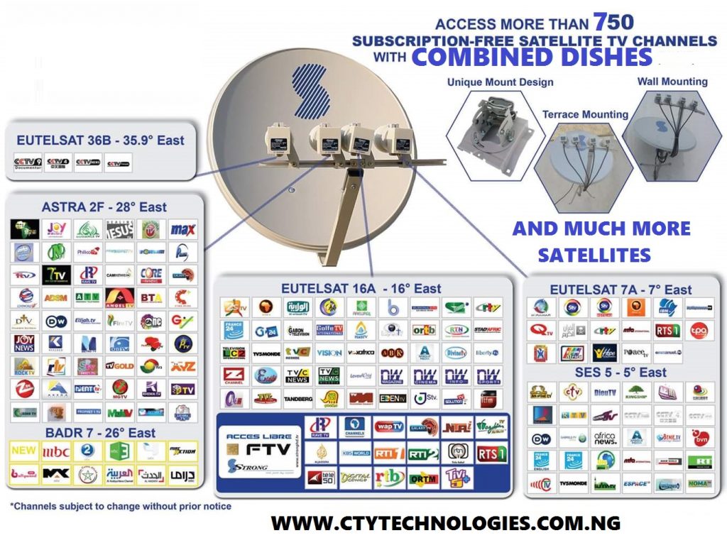 NOTE THAT THE CHANNELS AND SATELLITES LISTED BELOW CAN BE WATCHED FREELY WITH MANY DISHES COMBINED USING ONE DECODER ONCE YOU PURCHASE YOUR COMPLETE SET EQUIPMENTS JUST CALL AN INSTALLER TO TRACK ANY OF YOUR CHOICE SATELLITE! KINDLY MAKE PAYMENT AND USE THE ORDER PAGE TO SUBMIT ORDER FOR YOUR PURCHASED EQUIPMENTS!